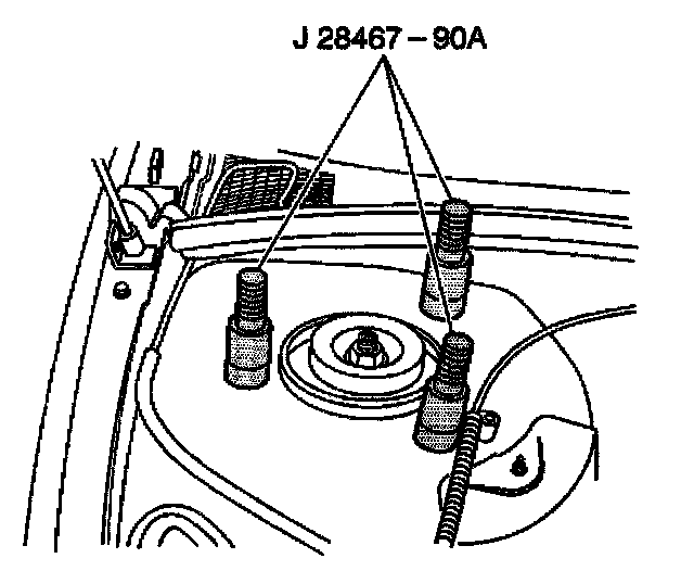 4. Install the strut tower support assemblies (J28467-5A) over the engine support adapters J28467-90A.