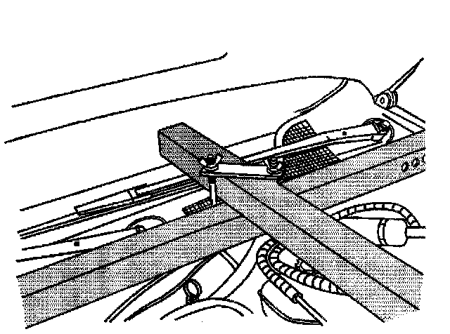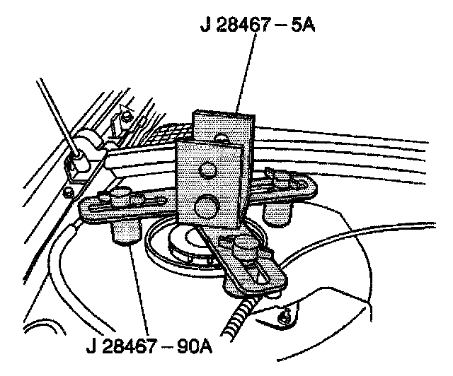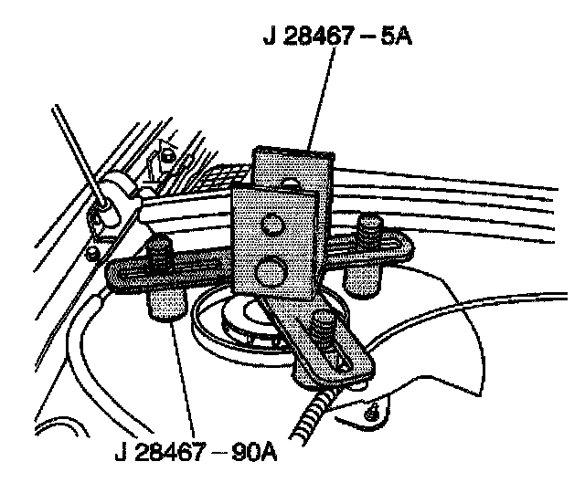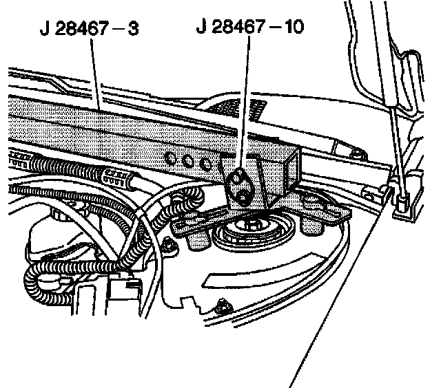 28. Adjust the driver side radiator shelf tube (J28467-2A) and the assembled lift hook bracket (J28467-6A) in order to align the hook with the left (front), rear of engine lift hook bracket.