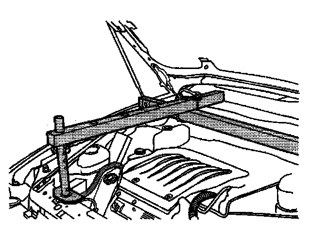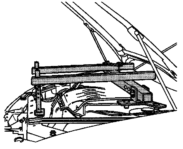 16. Place the rubber padded foot of the front support assembly (J28467-4A) on the vehicle radiator shelf. The foot position used in the front support assembly (J28467-4A) depends on the vehicle application.