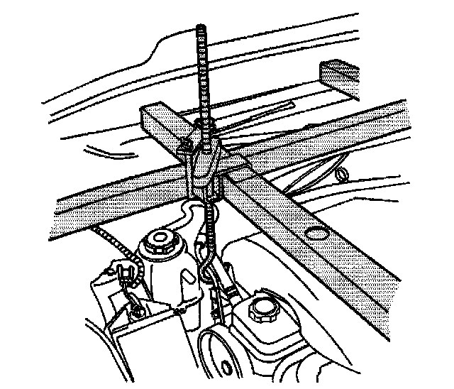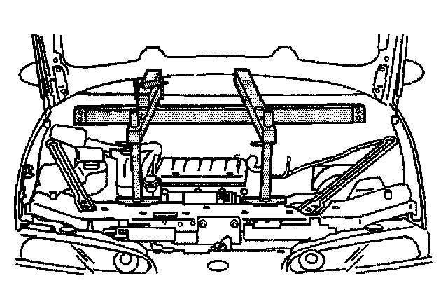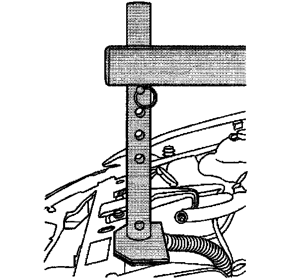 11. Place the rubber padded foot of the front support assembly (J28467-4A) on the vehicle radiator shelf. The foot position used in the front support assembly (J28467-4A) depends on the vehicle application.