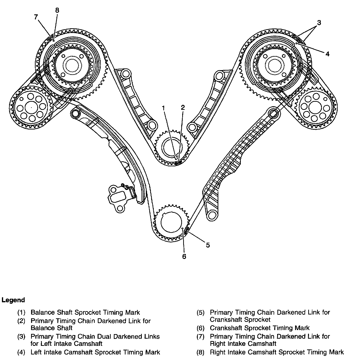 3. When installing the primary timing chain you must set the base engine timing. Base engine timing is set with cylinder number one at Top Dead Center (TDC) starting the intake stroke and with the correct camshaft to balance shaft to crankshaft relationship. To set the correct base engine timing proceed as follows: