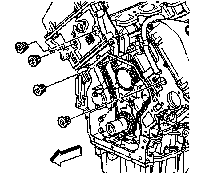 9. Remove the four chain guide access plugs located in the cylinder heads. Note the O-ring seal on each access plug.