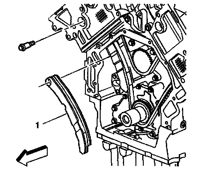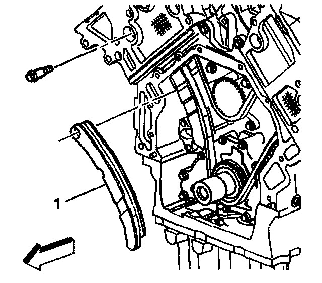 15. Remove the primary timing chain tensioner shoe (1) by pushing the guide downward slightly and then pulling it up through the cylinder head.
