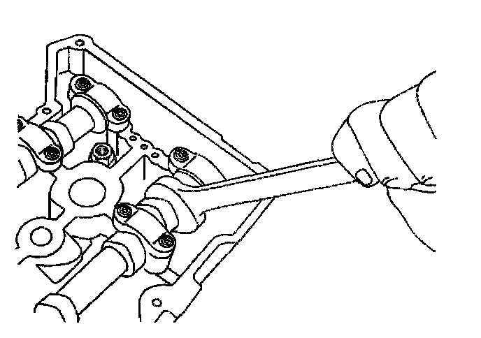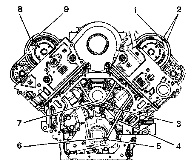 1. Remove the camshaft covers. Refer to Camshaft Cover Replacement (Front) or Camshaft Cover Replacement (Rear).