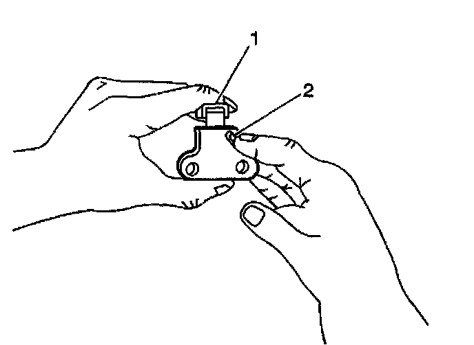 13. As the ratchet lever moves to its first click, hold the tensioner shoe inward. Insert a pin through the hole in the release lever.