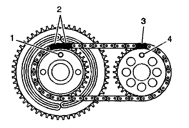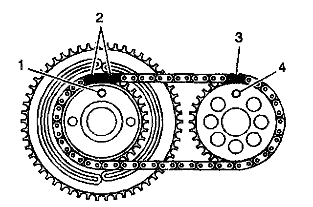 Align the intake sprocket drive pin (1) with the two darkened links (2).
