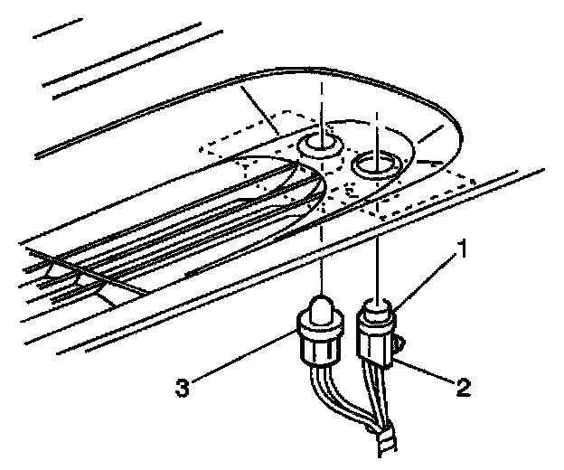 3. Disconnect the sunload temperature sensor (1) and the daytime running lamp light sensor (3) from the defroster grille.