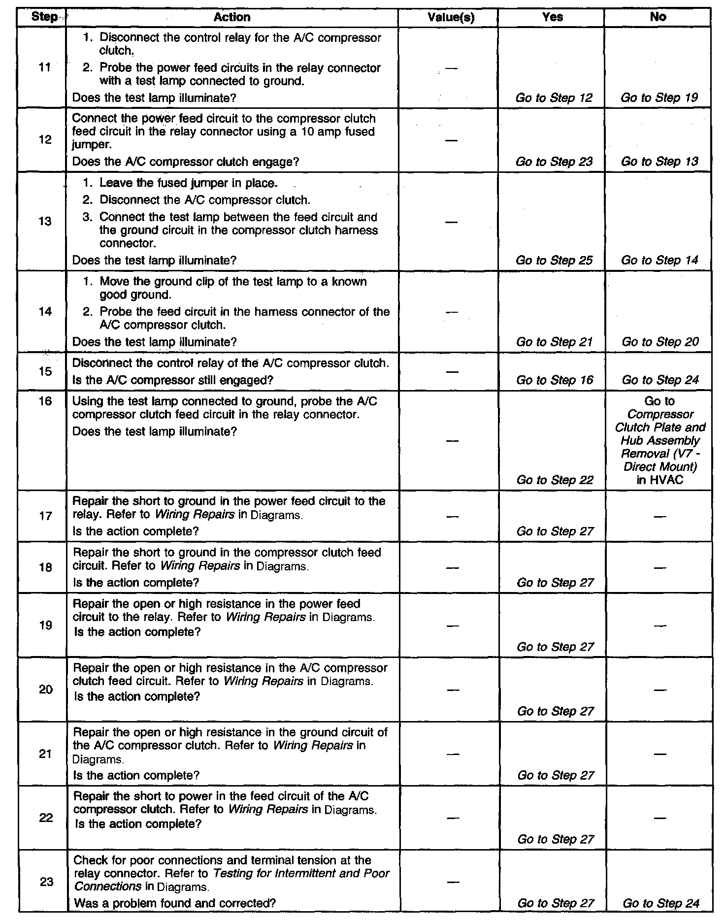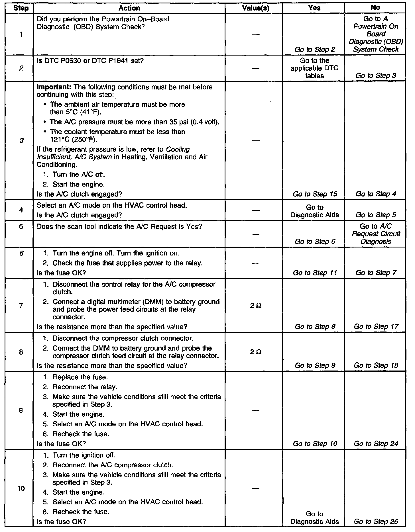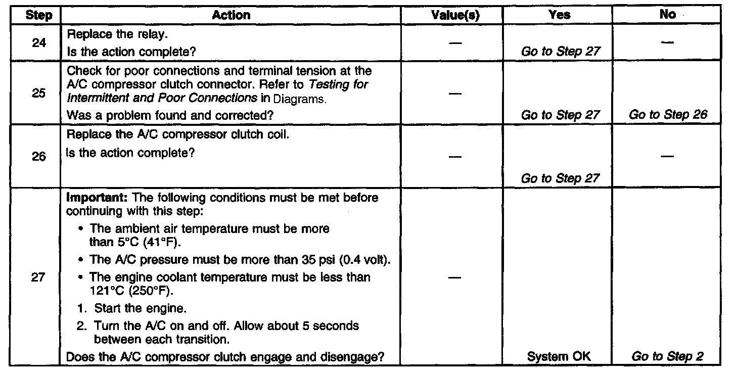 3. Under certain conditions, the PCM may engage the A/C compressor clutch briefly at start-up. Answer Yes to this step if the A/C compressor clutch remains engaged after the engine is started with all of the A/C controls in the Off position.