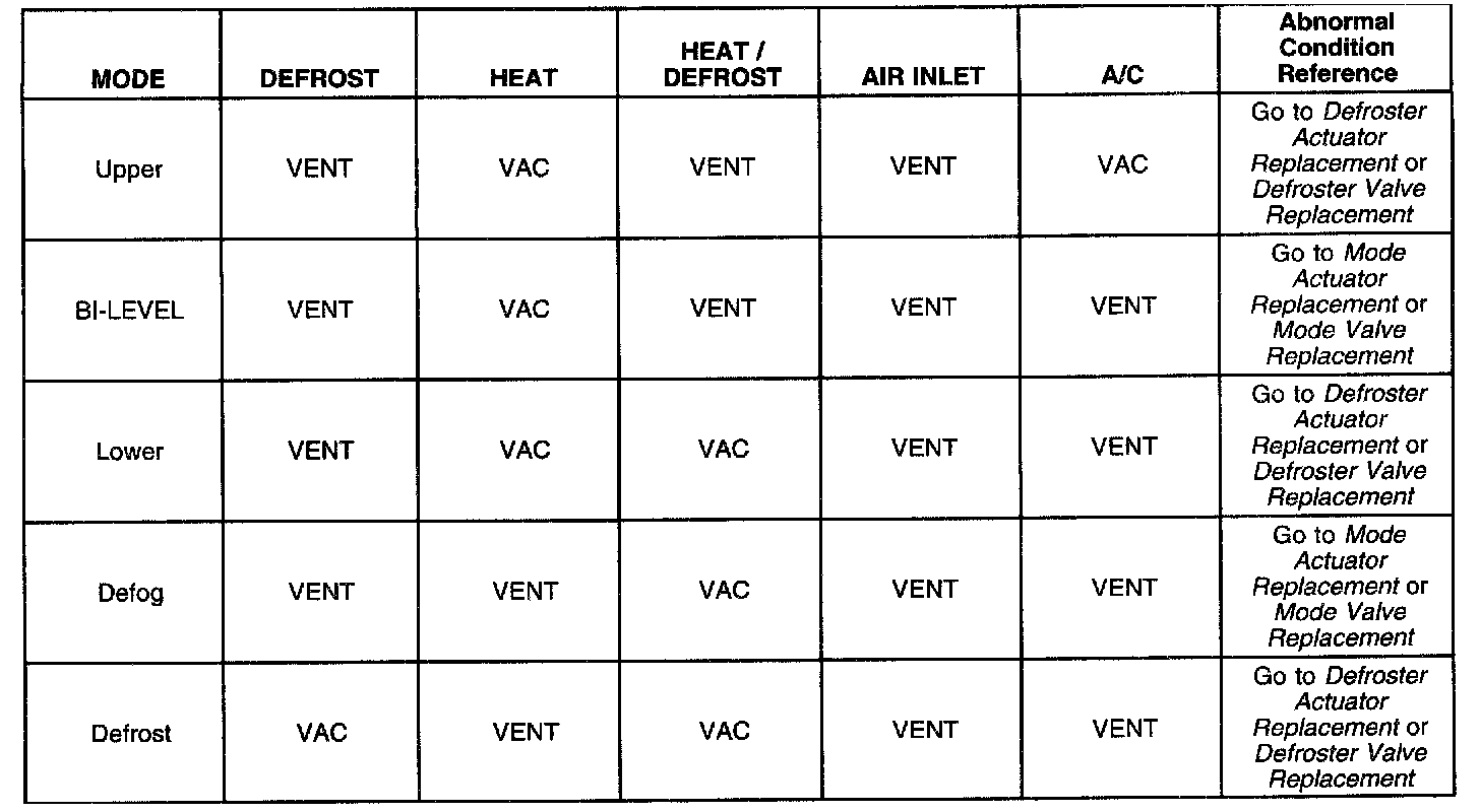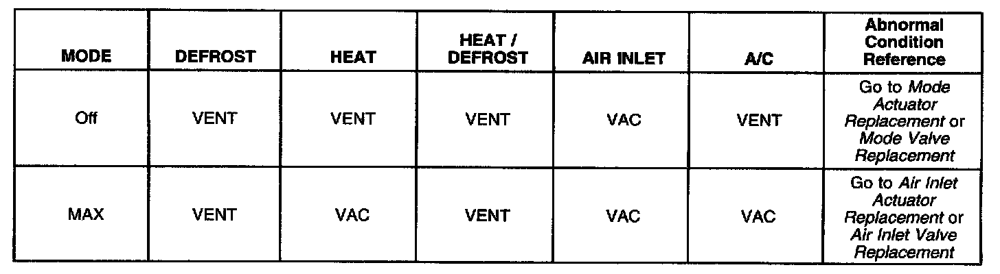 ^ Inspect for vacuum to the mode valve actuators by noting the mode valve actuator position. When vacuum is applied, the actuator will retract, refer to the Air Delivery Vacuum Distribution table below.