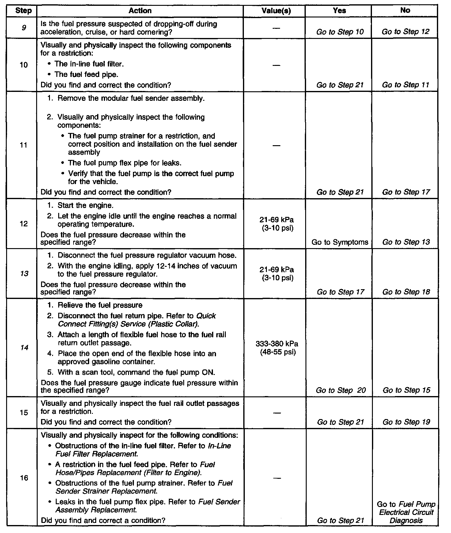 9. Fuel pressure that drops-off during acceleration, cruise, or hard cornering may cause a lean condition A lean condition can cause a loss of power, surging, or misfire and may be diagnosed using a scan tool. If an extremely lean condition occurs, the oxygen sensors may drop below 500 mV and the fuel injector pulse width will increase.