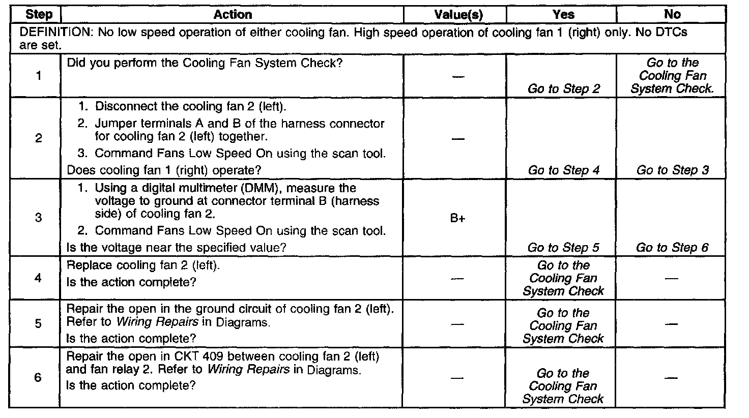 The numbers below refer to the step numbers on the Cooling Fan System Check Table.
