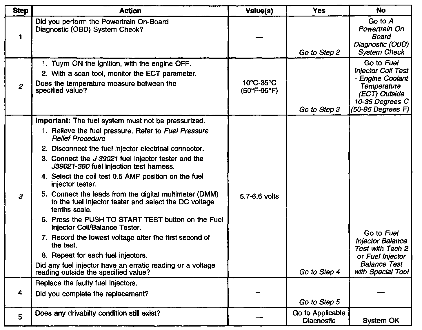 2. The engine coolant temperature affects the ability of the fuel injector tester to detect a faulty fuel injector. If the engine coolant temperature is NOT Between 10°C-35°C (50°F-95°F), go to Fuel Injector Coil Test Procedure - Engine Coolant Temperature Outside 10°C-35°C (50°F-95°F). Component Tests and General Diagnostics