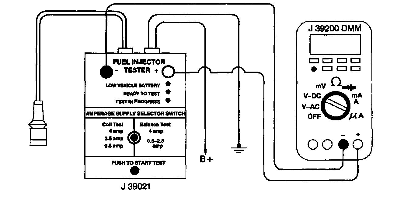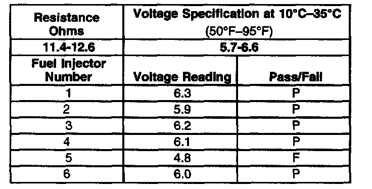 3. The first second of the voltage displayed by the DVM may be inaccurate due to the initial current surge, therefore, record the lowest voltage displayed by the DVM after the first second of the test. The voltage displayed by the DVM should be within the specified range (refer to the Example). The voltage displayed by the DVM may increase throughout the test as the fuel injector windings warm and the resistance of the fuel injector windings changes. An erratic voltage reading (large fluctuations in voltage that do not stabilize) indicates an intermittent connection within the fuel injector.