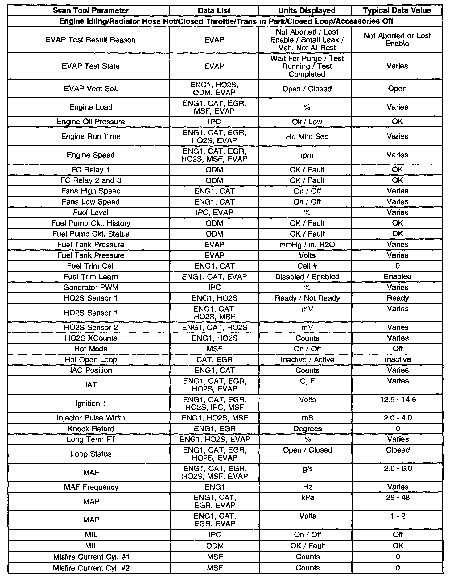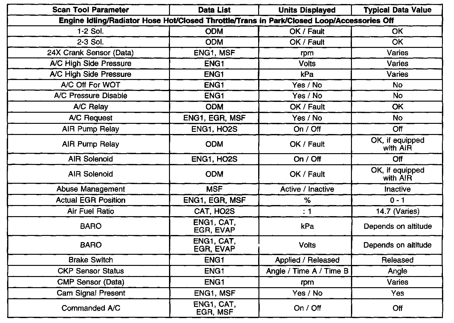 The Engine Scan Tool Data List contains all engine related parameters that are available on the scan tool. The list is arranged in alphabetical order. A given parameter may appear in any one of the data lists, and in some cases may appear more than once, or in more than one data list in order to group certain related parameters together.