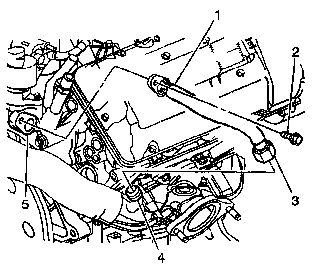 1. Remove the mounting bolt (2) that attaches the EGR inlet pipe flange to the coolant crossover assembly (5).