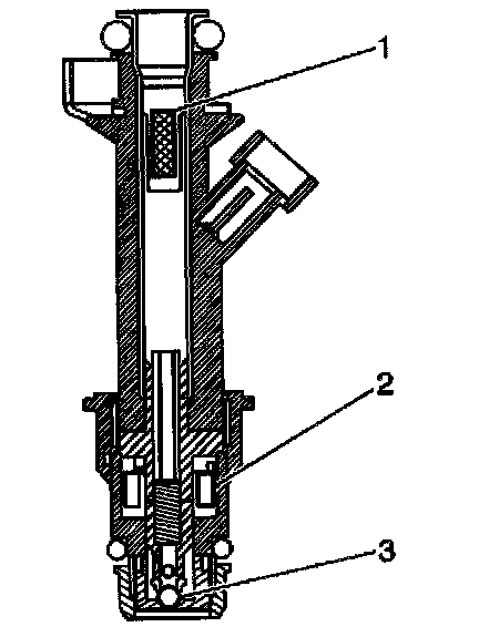The MULTEC 2 MPFI fuel injector assembly is a solenoid operated device, Controlled by an on-board computer called the Powertrain Control Module (PCM), that meters fuel to a single engine cylinder. The PCM energizes the high-impedance (12.0 ohms) solenoid (2) to open a normally closed ball valve (3). This allows fuel to flow into the top of the injector (1), past the ball valve, and through a director plate at the injector outlet. The director plate has precision holes that control fuel flow, generating a spray of finely atomized fuel at the injector tip. Fuel from the injector tip is directed at the intake valve, causing it to become further atomized and vaporized before entering the combustion chamber.