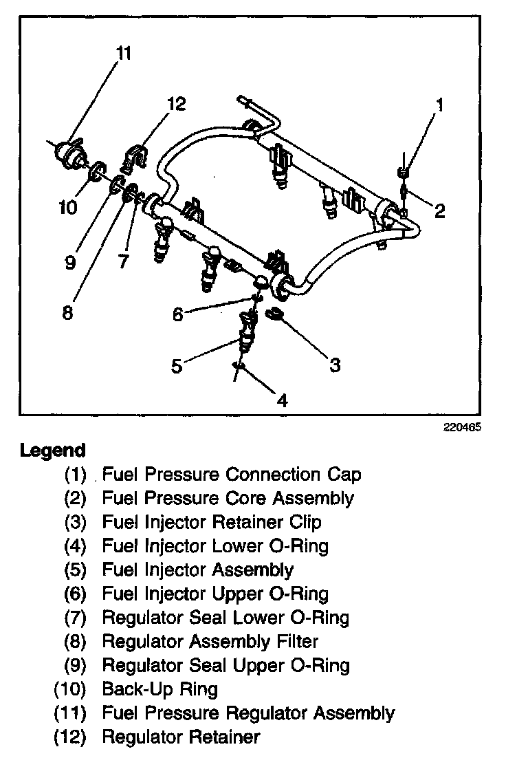 The fuel rail is mounted to the top of the engine and distributes fuel to the six individual fuel injectors. The fuel is delivered to the fuel inlet tube of the fuel rail by the fuel pipes. The fuel then goes through the fuel rail to the fuel pressure regulator. The fuel pressure regulator maintains a constant fuel pressure at the fuel injectors. Any fuel in excess of the injector needs flows through the pressure regulator assembly to the outlet port of the fuel rail and through the fuel return pipe to the fuel tank to begin the cycle again. The fuel pressure can be observed using a fuel pressure gauge at the fuel pressure gauge connection.