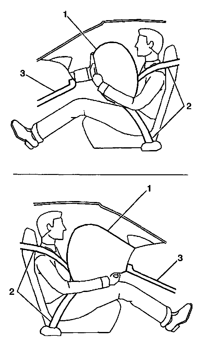 The Supplemental Inflatable Restraint (SIR) system supplements the protection offered by the driver and front passenger seat belts (2). The SIR system deploys an air bag (1) from the center of the steering wheel and from the right side of the instrument panel.