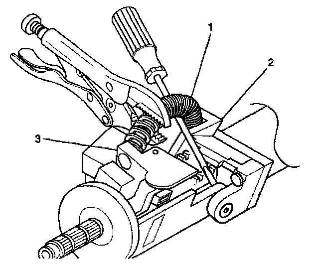 Caution: The tilt spring and the spring guide are under pressure. The tilt spring and the spring guide may become a projectile. Secure the spring with locking pliers during removal. Secure the spring with locking pliers during installation. Bodily injury may result during removal and installation of the tilt spring and the spring guide. Always use caution during removal and installation of the tilt spring and the spring guide.