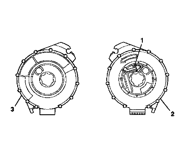4. If no centering window is present on the front side (3) of the SIR coil assembly, but a spring service lock (1) is on the back side (2), perform the following steps: