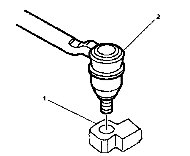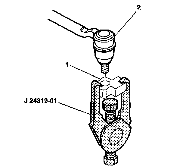 5. Using the special tool J 24319-01 remove the outer tie rod assembly (2) from the steering knuckle (1).
