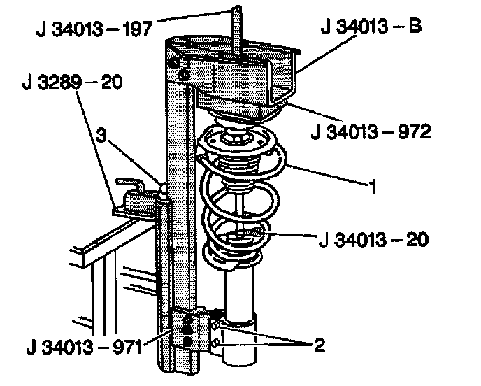 2. Install the strut (1) in the J 34013-B Using adapters J 34013-971 J-34013-972 and the J 3289-20.
