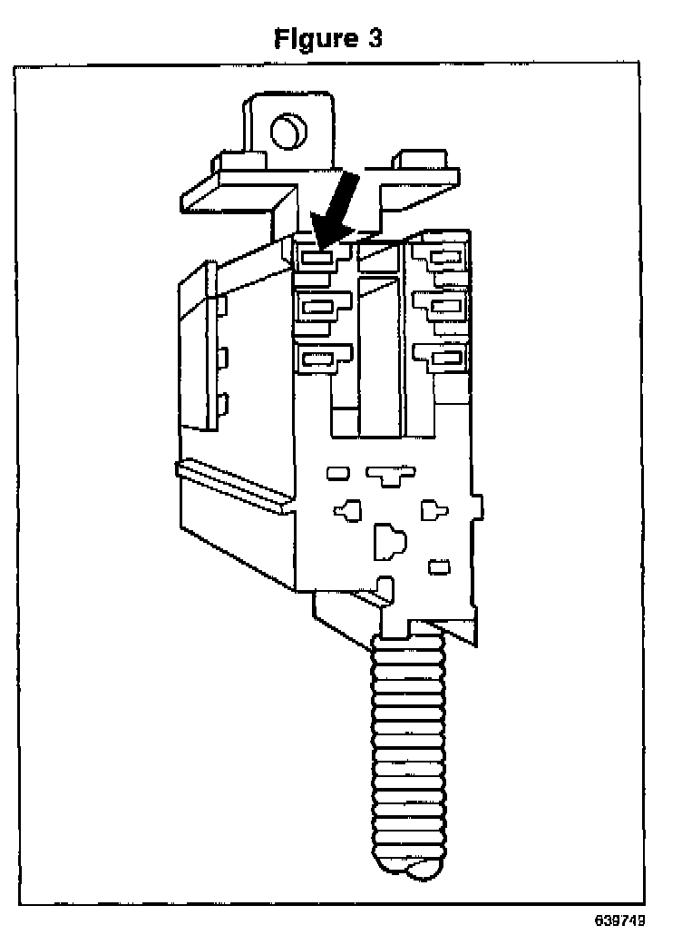 - Inspect the new bus bar to locate the bus bar to housing retainers. Three tabs must be depressed individually with the pocket screwdriver. See the arrow in Figure 3 to allow the bus bar to be removed from the back side of the block.