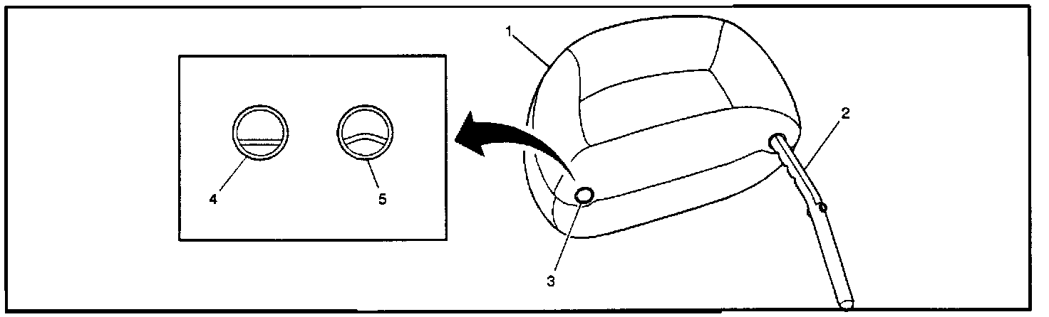 1. Remove the head restraint from the seat by raising it to the full-up position and inserting a small rounded tool, such as an allen wrench, into the hole in the guide assembly in order to release the lock tabs. If additional information is needed when removing the head restraint, refer to the Seats sub-section of the Body and Accessories section of the appropriate Service Manual.