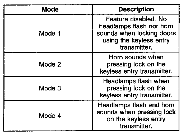 ^ The BCM sounds the chime a number of times equivalent to the remote unlock verification mode. A transition past mode 4 repeats the sequence starting with mode 1.