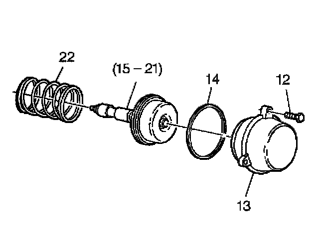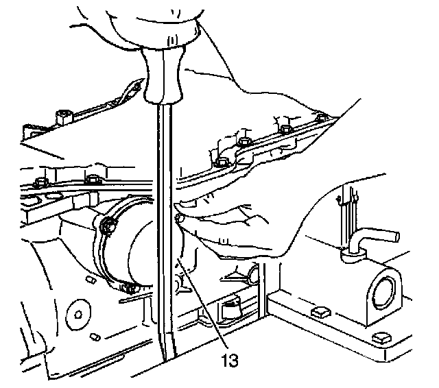 1. Position the transmission so that the oil pan is facing up.2. Use a long screwdriver in order to compress the forward band servo assembly cover (13) by prying against the work bench.