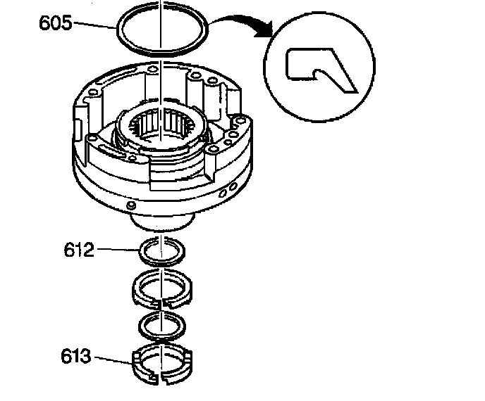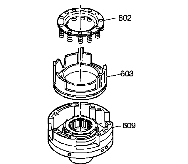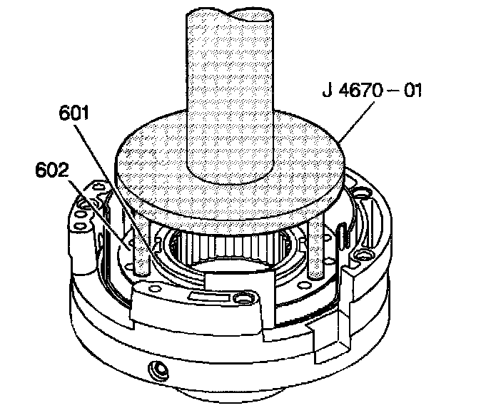 1. Use J 4670-01 clutch spring compressor in order to compress the fourth clutch spring assembly (602). Remove the snap ring (601) from the driven sprocket support assembly.