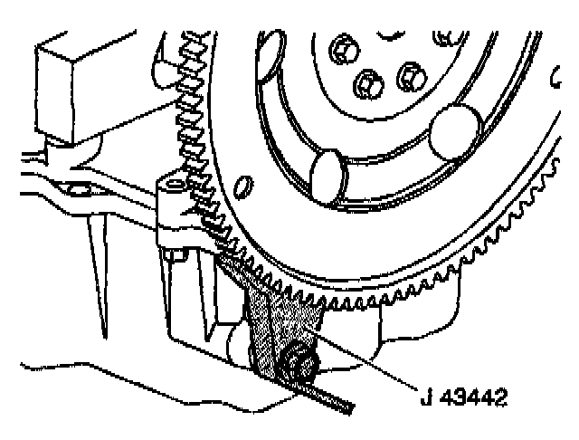 16. Use the J 43442 in order to gain access to the torque converter bolts and prevent the flywheel from turning.