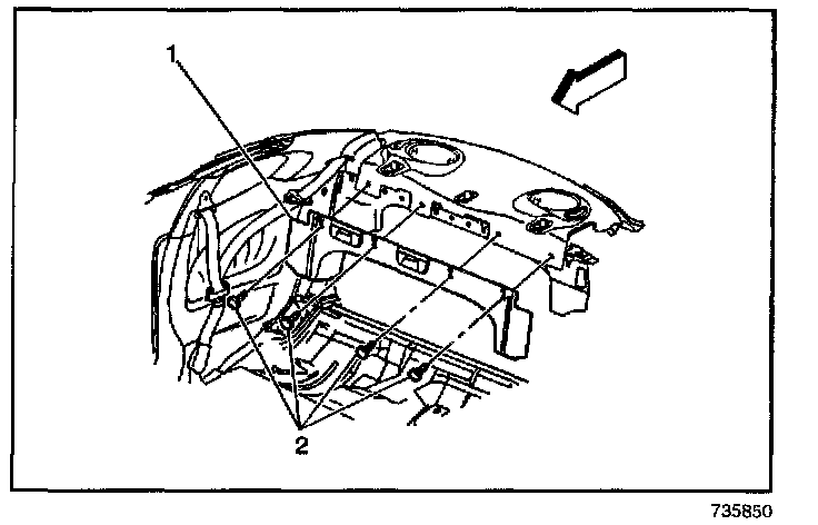 13. Using the J 38788 tool, remove the push-in retainers (2) which retain the rear shelf trim panel to the seat backrest support.