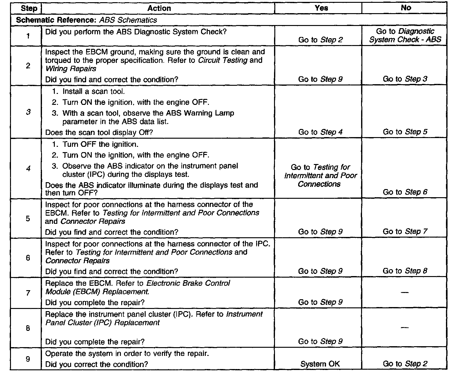 The numbers below refer to the step numbers on the diagnostic table.