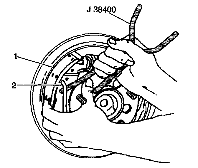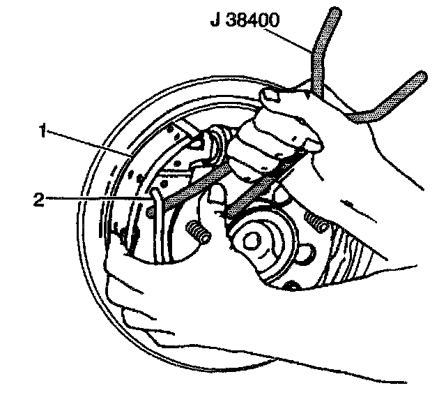 3. Position the hook end of the J 38400 under the universal spring and lightly pull the universal spring end (2) out while installing the primary shoe. Ensure that the universal spring properly engages the primary brake shoe web hole.