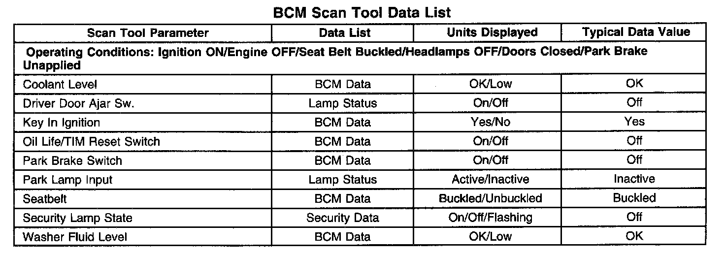BCM Scan Tool Data List: