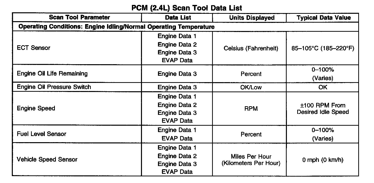 Scan Tool Data List - Powertrain Control Module (PCM)