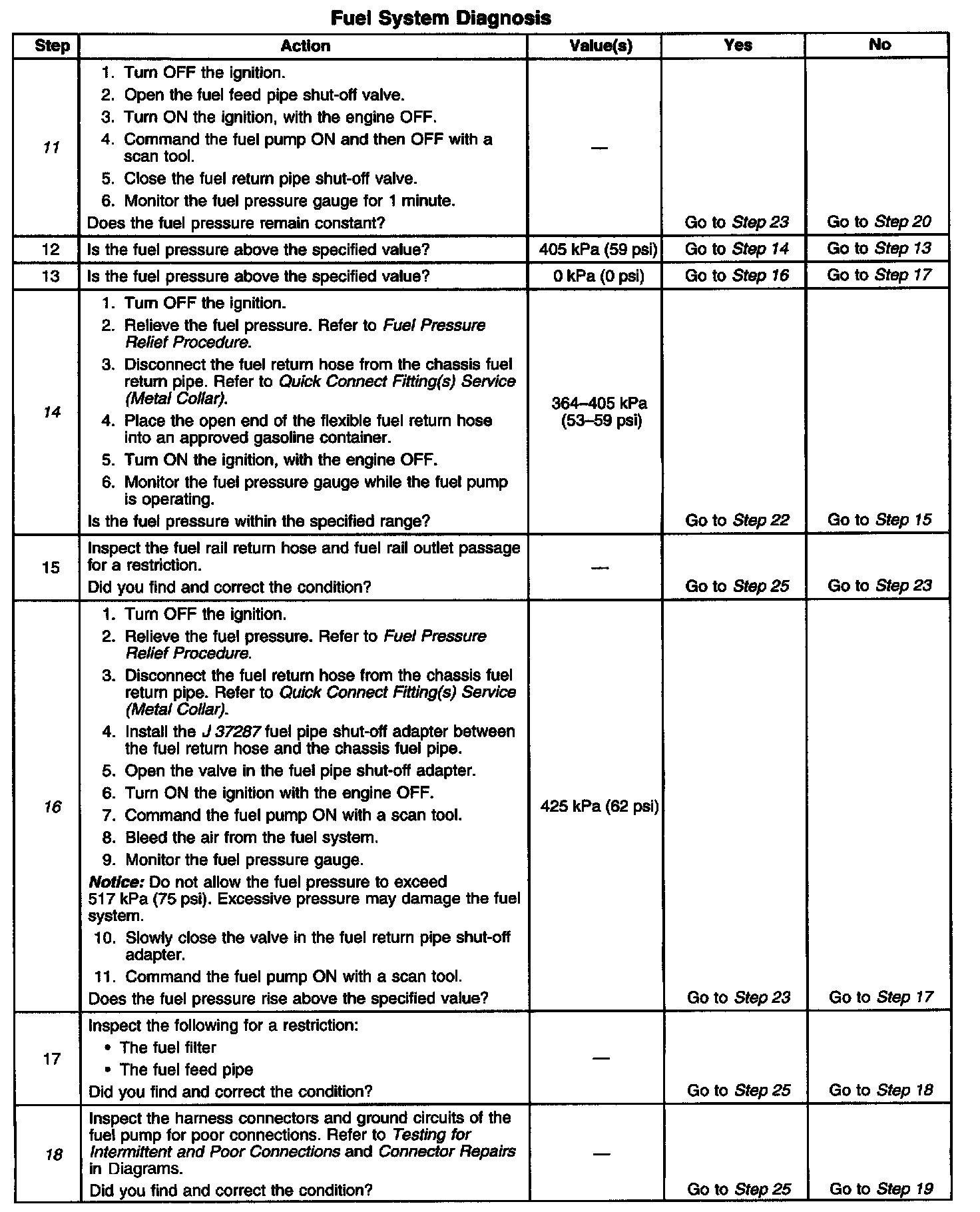 14. This step tests for a restricted fuel return pipe. If the fuel pressure is within the specified values, a restriction in the fuel return pipe is indicated.