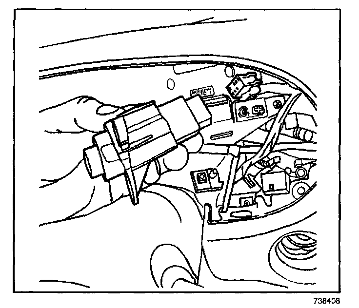 11. Remove the ignition switch lock cylinder from the ignition switch, by depressing the retaining tab and pulling the cylinder out with the key.
