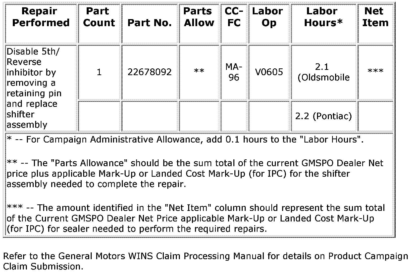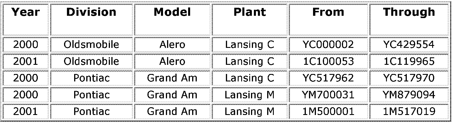 Involved are certain 2000-01 Oldsmobile Alero and Pontiac Grand Am model vehicles equipped with manual transaxle (RPO M86) and built within the VIN breakpoints shown.