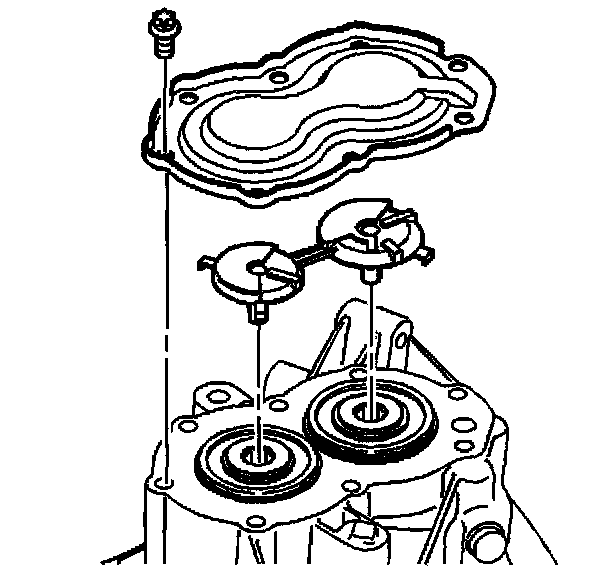 18. Install the housing onto the shift forks and the shafts on to the J 44375. Line up the shift forks and the shafts with the housing.