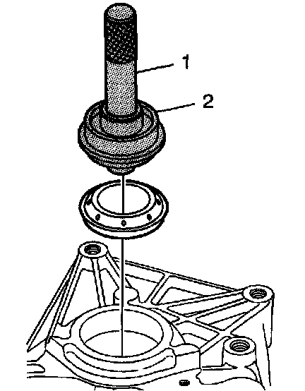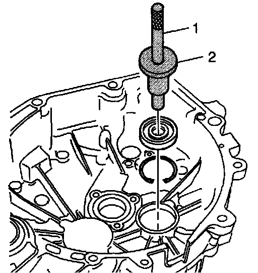 5. Install a new differential side bearing race to the transmission housing using the J 44385 (2) and the J 7079-2 (1).