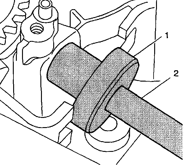 2. Install a new shifter shaft bearing flush with the casting in the transmission housing, using the J 44381 (1) and the J 8092 (2).
