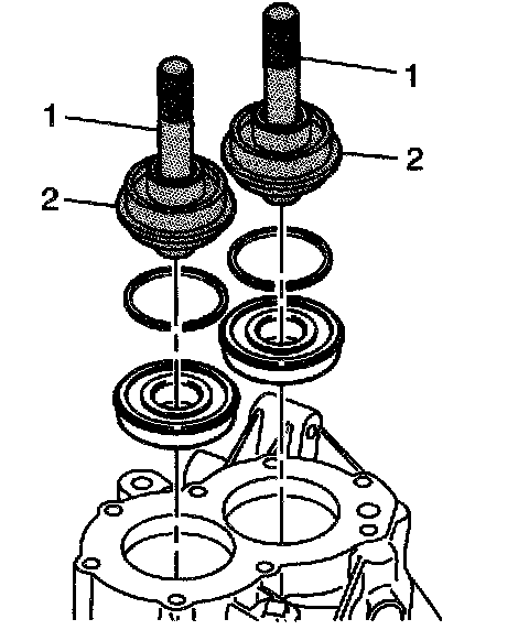 6. Install a new differential side bearing race seal to the transmission housing using the J 44385 (2) and the J 7079-2 (1).