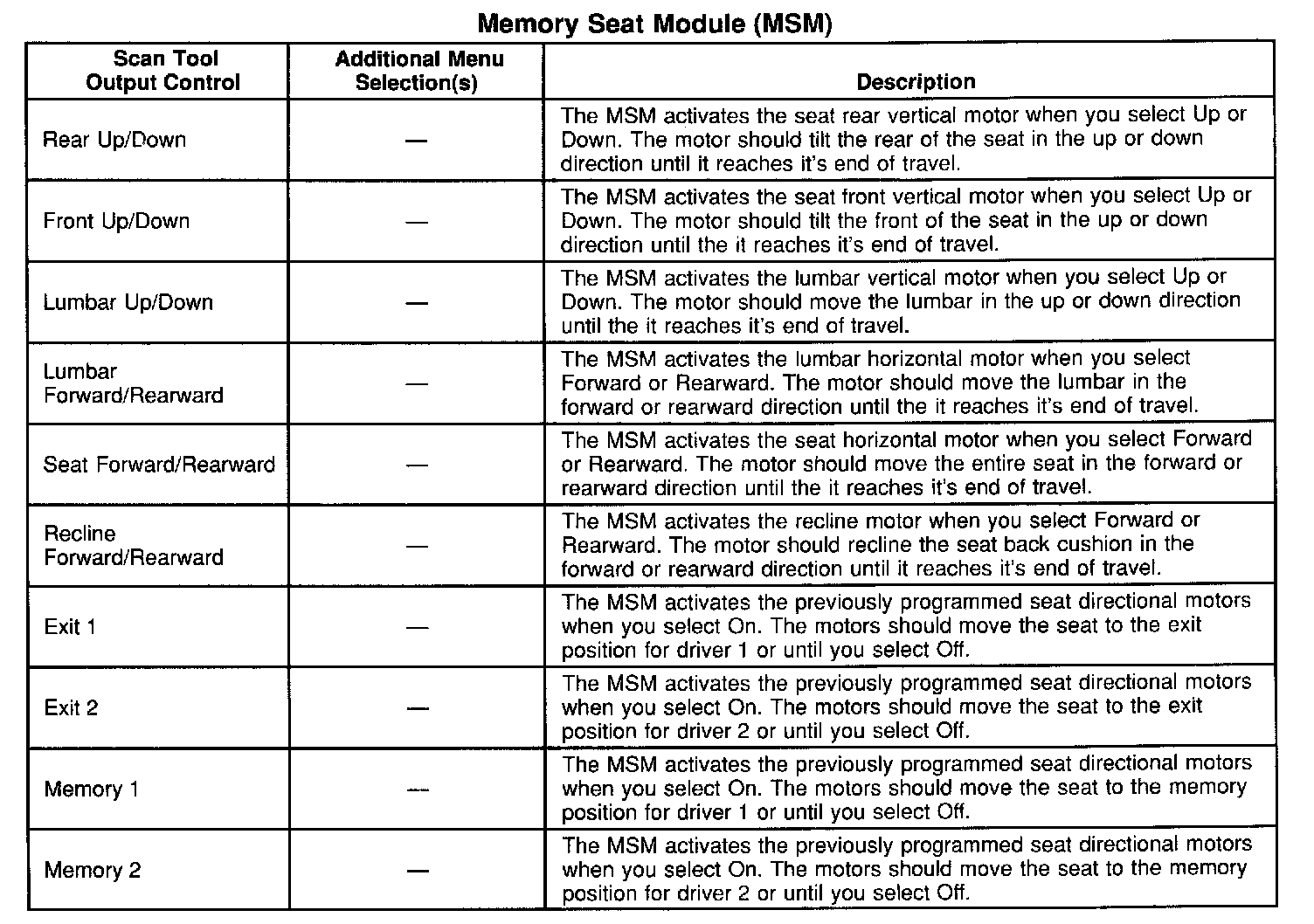 Scan Tool Output Controls - Memory Seat Module (MSM)
