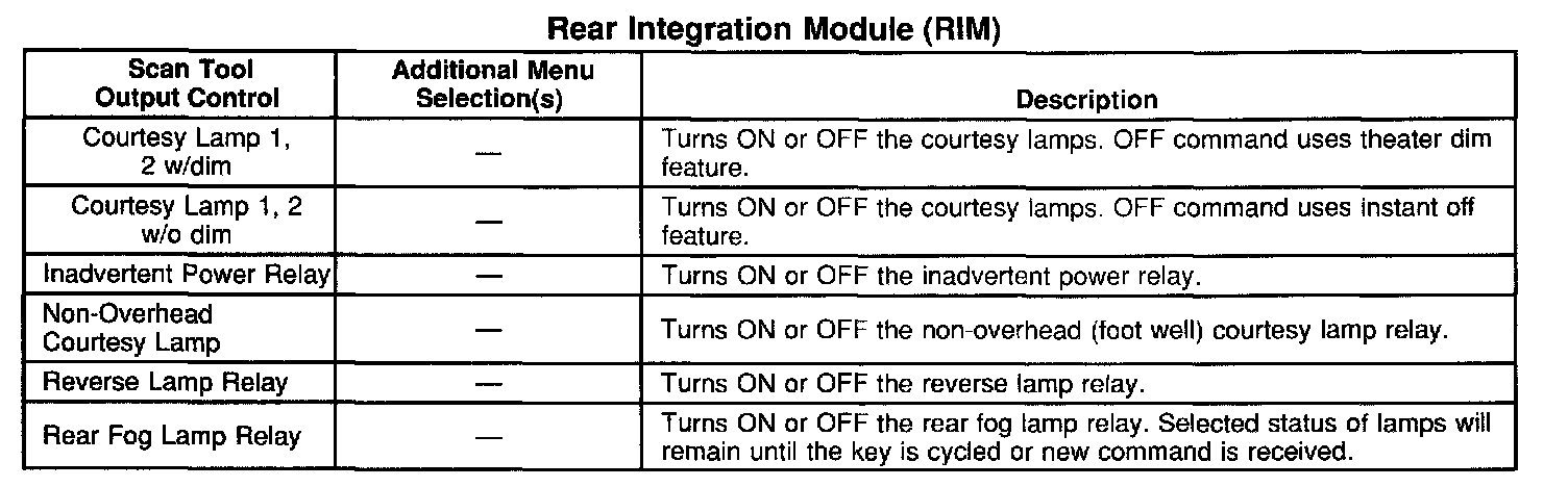 Scan Tool Output Controls - Rear Integration Module (RIM)