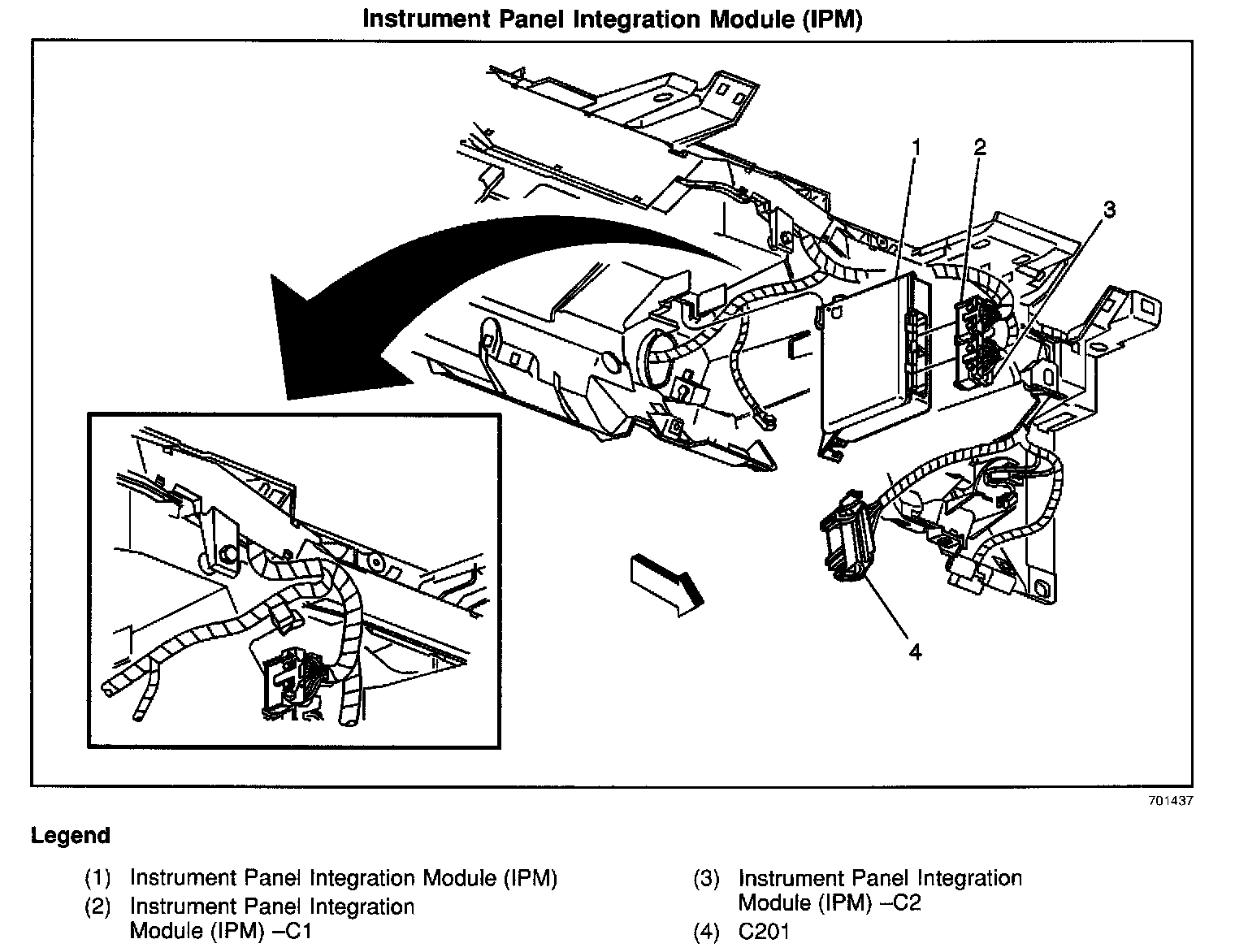 Behind the center of the IP, located behind the heater and A/C controls, near the HVAC case