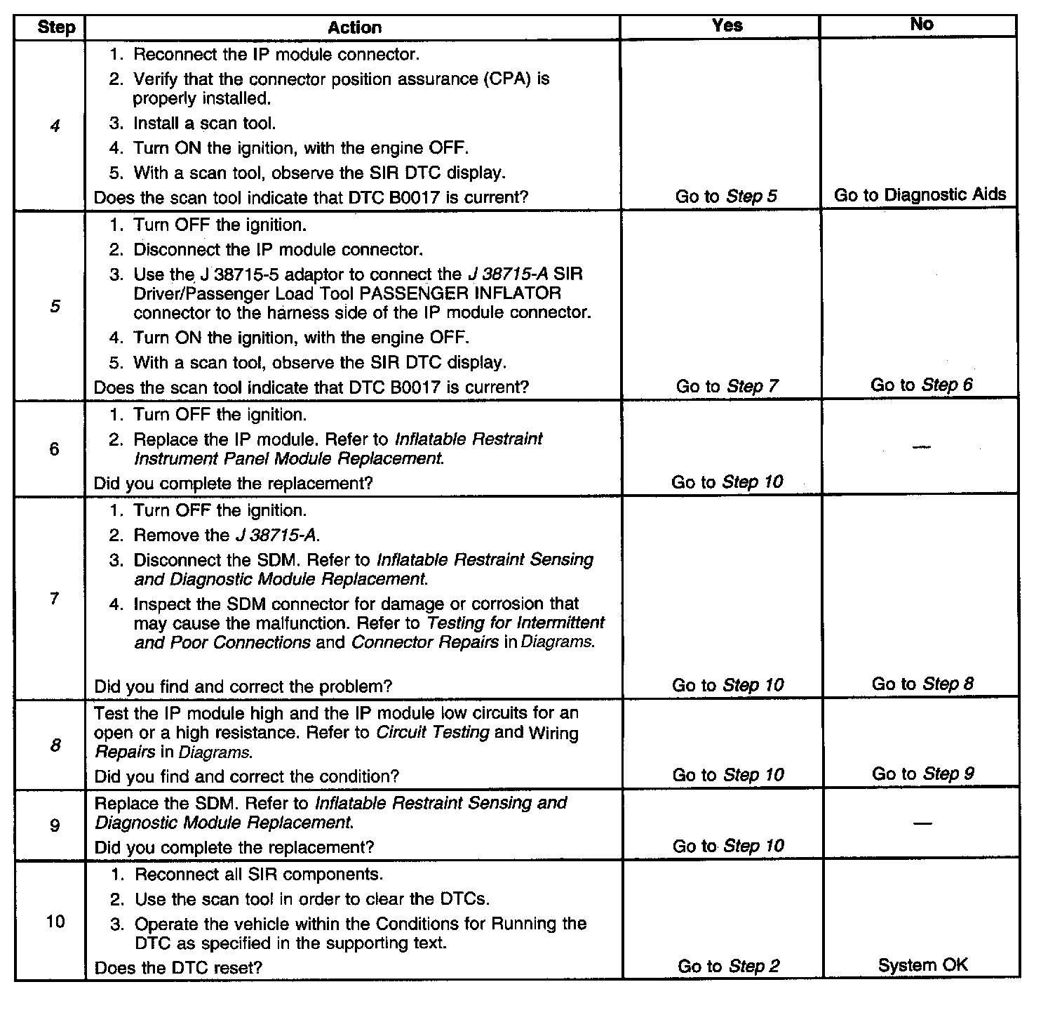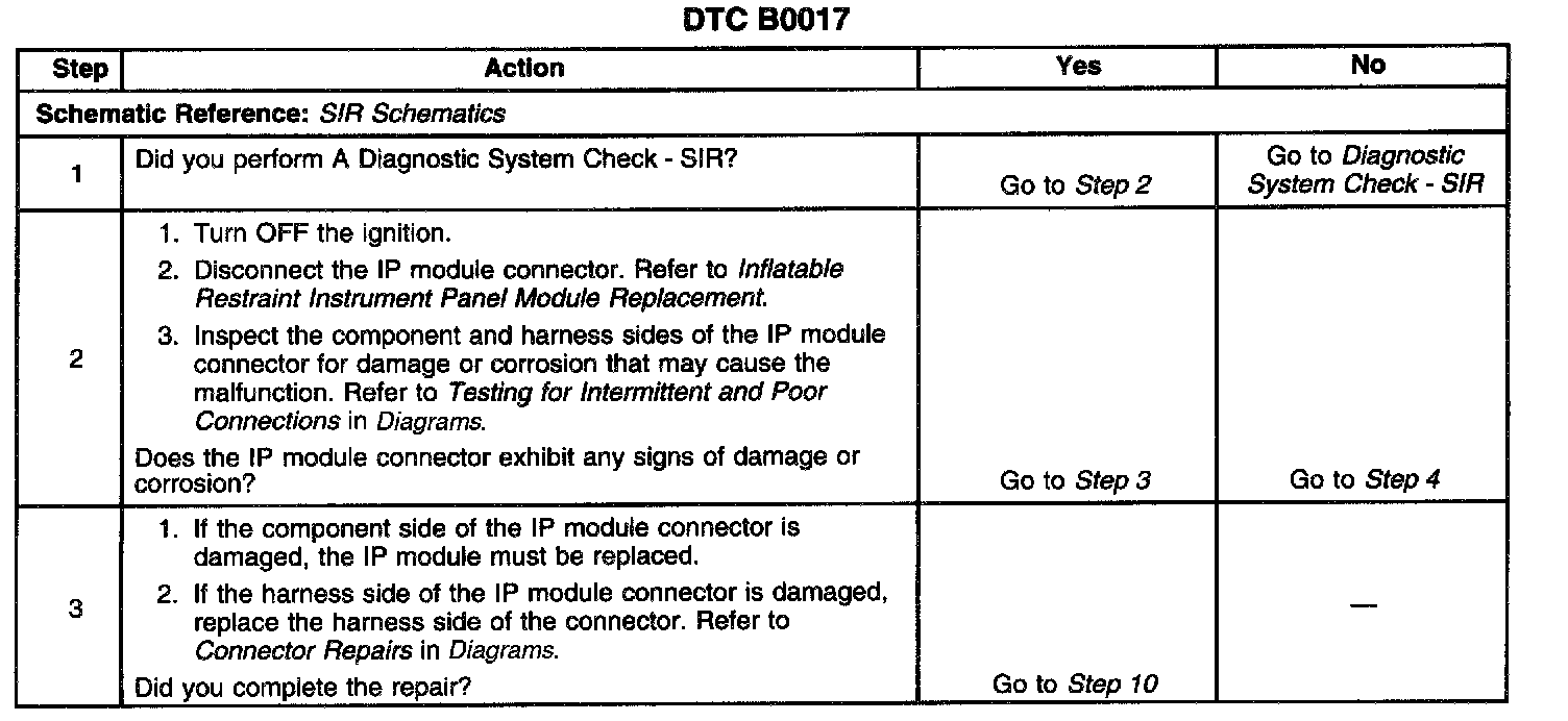 The inflatable restraint IP module deployment loop consists of the inflatable restraint IP module, the IP module high and IP module low circuits. A shorting bar is used in the inflatable restraint IP module connector which will short together the IP module high and the IP module low circuits when the connector is disconnected. This will help prevent unwanted deployment of the IP module during servicing. When the ignition is turned ON, the inflatable restraint sensing and diagnostic module (SDM) performs continuous diagnostic tests on the deployment loop to check for proper circuit continuity and for shorts to ground or voltage. If a malfunction is detected, the SDM will store a diagnostic trouble code (DTC).