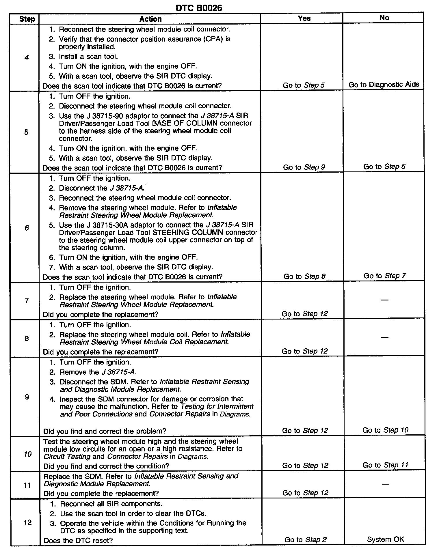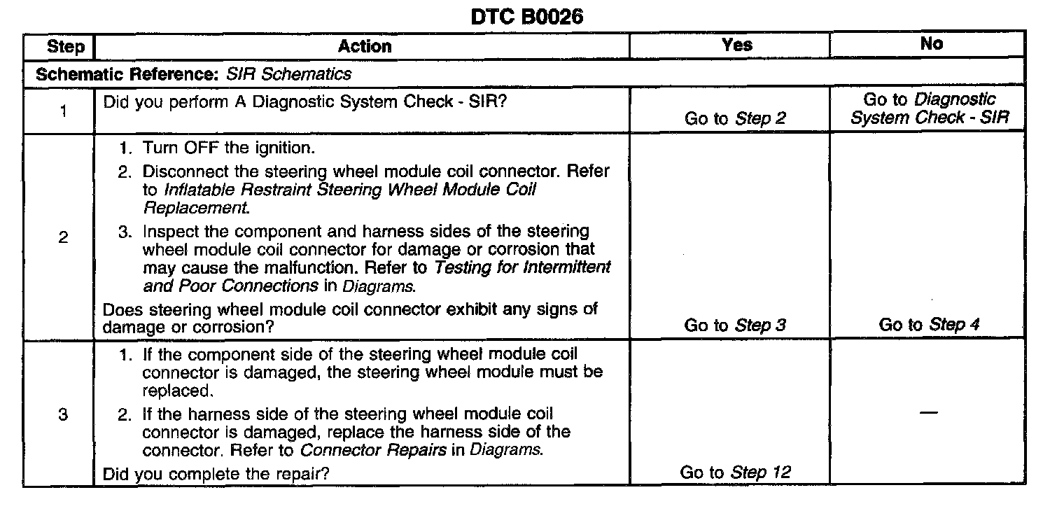 The inflatable restraint steering wheel module deployment loop consists of the inflatable restraint steering wheel module, the inflatable restraint steering wheel module coil, and the steering wheel module high and steering wheel module low circuits. A shorting bar is used in the inflatable restraint steering wheel module coil connector which will short the steering wheel module high and steering wheel module low circuits when the connector is disconnected. This will prevent unwanted deployment of the steering wheel module during servicing. When the ignition is turned ON, the inflatable restraint sensing and diagnostic module (SDM) performs continuous diagnostic tests on the deployment loop to check for proper circuit continuity and for shorts to ground or voltage. If a malfunction is detected, the SDM will store a diagnostic trouble code (DTC).