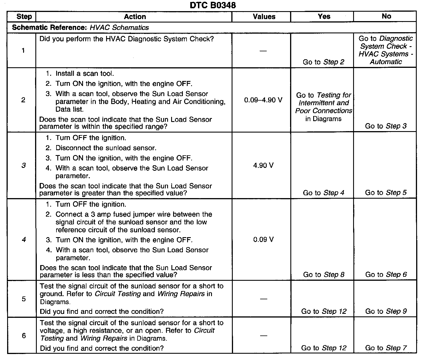 CIRCUIT DESCRIPTIONThe HVAC control module monitors the ambient light on the inside of the vehicle via a light sensitive photodiode which is called a sunload sensor. The HVAC control module uses this information to compensate for the effect of the sun on the inside air temperature of the vehicle. When the sensor is in direct sunlight, the signal voltage is low. When the sensor is shaded, the signal voltage is high. The HVAC control module requests A/C compressor clutch engagement and controls the air temperature actuator door positions in order to maintain the selected air temperature.